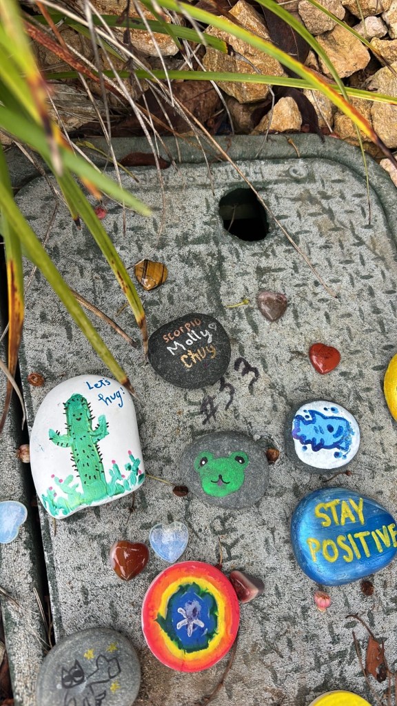 Eventually, I notice the tide rising, and something in my gut tells me we need to leave. I listen. As we were walking back, a big wave crashed hard, almost sweeping us. Molly lags behind for a moment, drawn to a rock she says has been calling her. She finally finds it and says, “this is the one.” We keep walking back and pass by a little rock altar covered in hand-painted stones. Molly stops and goes, “THIS is why the rock was calling me.”