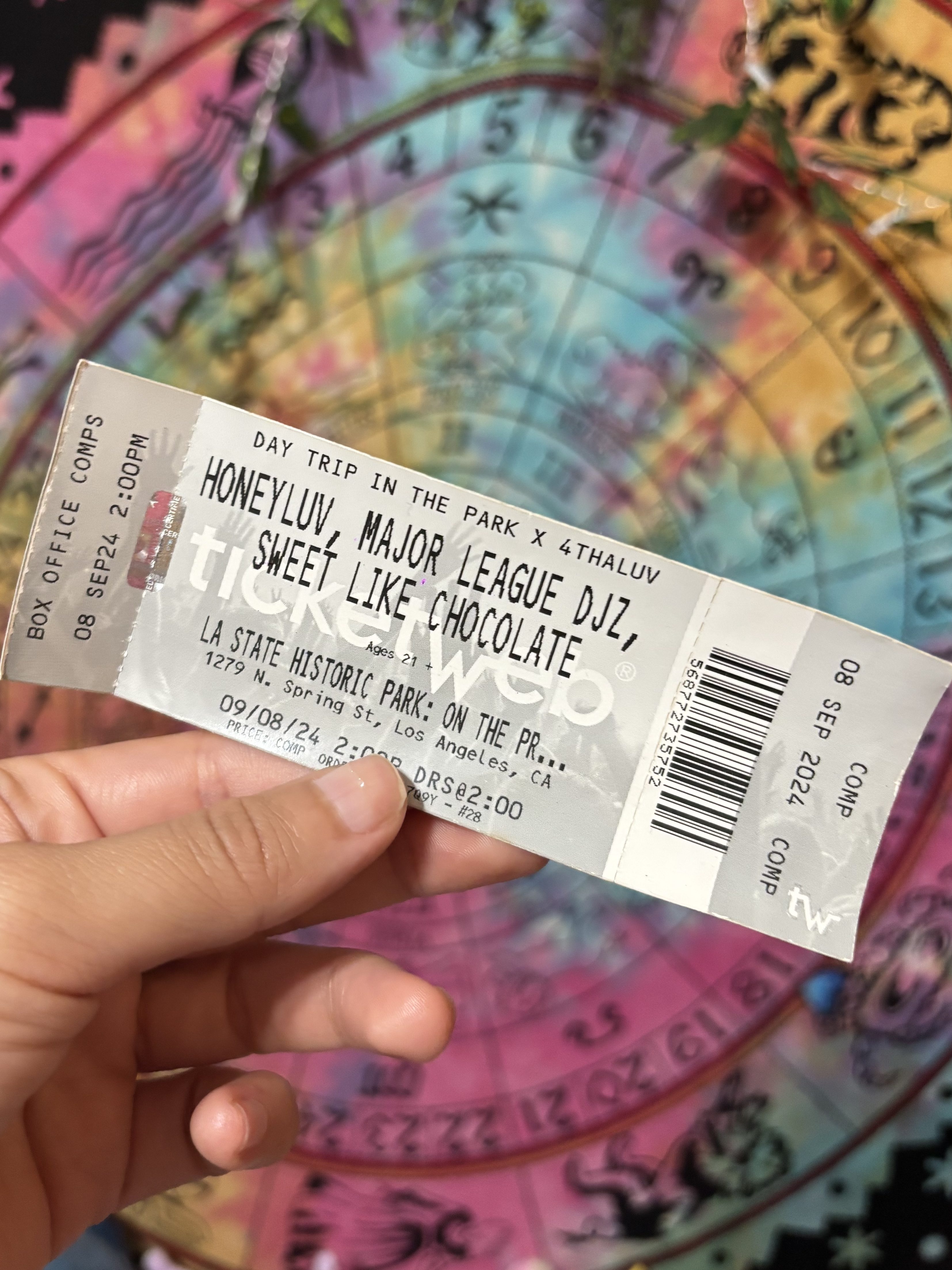 To bring this experience into sharper focus, I return to memory as a method that embodies emotions and lived experiences. I remember that day as if it were yesterday. It was the last DayTrip in the Park Sunday event of the summer, and the show was completely sold out. I remember that the line wrapped around the venue to enter. The heat pushed nearly 100 degrees which added a type of energy that made everyone move and caught in the rhythm. The crowd, both backstage and in general admission, was full of Black and Latinx people. It was beautiful to see, especially because at past events, the backstage area had mostly been filled with white girls during other DJs’ sets. The event took place at Los Angeles State Historic Park and was designed around a summer, tropical oasis theme kind of like taking a quick trip to paradise, but just for the day. The “DayTrip” sign at the entrance reinforced that feeling, hinting at an escape into a vibrant, sunny world through house music. Disco balls and plants hung from the ceiling, catching the light and adding to the atmosphere of celebration and joy.