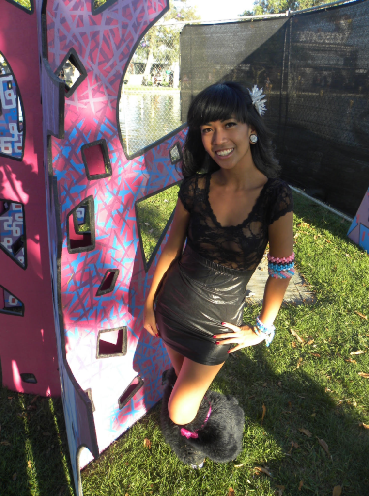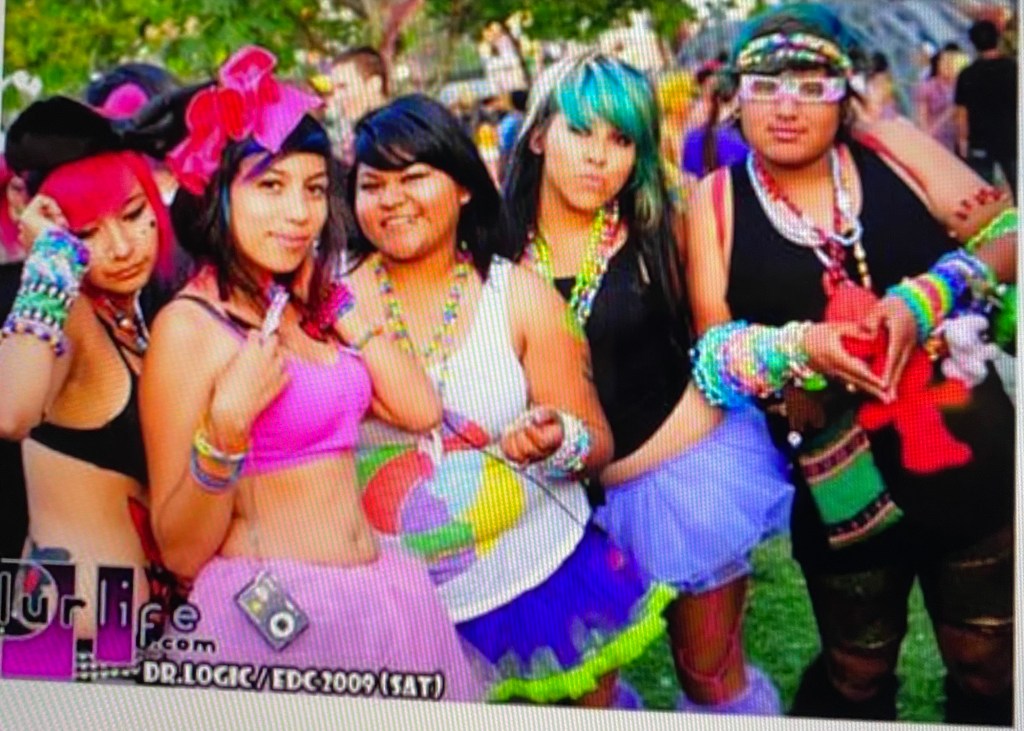 The fashion choices during their early raving years, painted a picture of color, creativity, and self-expression rooted in the styles of their time. Molly Margarita recalled teasing her voluminous hair, often adding hot pink clip-ins and a Hello Kitty accessory that drew inspiration from early Jersey Shore aesthetics and the “scene queen” look of the late 2000s. She wore bright tutus, daisy-decorated bras, and furry boots, proudly embracing what she called a “whimsical ballerina” style. A friend once told her he could tell she was an old-school raver just by the way she dressed, something that Molly took as a compliment. Mama K’s style was similar: she often shopped in the fashion alleys of Hollywood, putting together looks with lingerie tops, short shorts (often American Apparel dupes), sequined pieces, and her iconic Hello Kitty backpack. Her outfits were always accented by kandi stacked from wrist to elbow, platform flats from CVS, and big, pushed-up hair with extensions. She shared that some of them flew off while on a ride for a festival. For La Lucha, fashion was a way to pay homage to the ravers of the ’90s. His first full outfit featured a black tank top, sparkly gold lamé shorts from American Apparel (regardless of gender labels), matching black fluffies, and bright green hair. Like the others, his arms were covered in kandi, and he described PLUR not just as a slogan but as a style that allowed him to feel bold, visible, and free. Altogether, their early fashion choices were bold statements of identity, colorful, DIY, aesthetics that deeply tied to the sense of belonging rave culture offered.